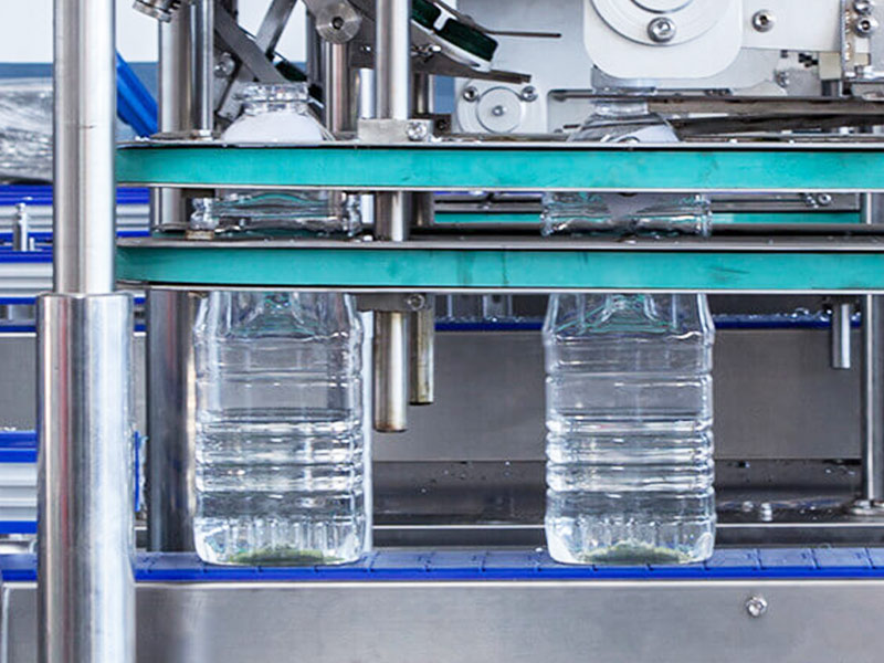 The conveyor system connects each machine seamlessly, ensuring smooth bottle transfer and synchronized production flow across the entire line.